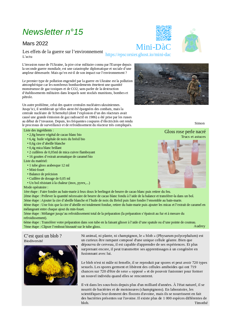 La guerre en Ukraine pourrait avoir un impact sur l'environnement. Nous vous proposons une recette de gloss rose perle nacré, et des informations sur le blob.